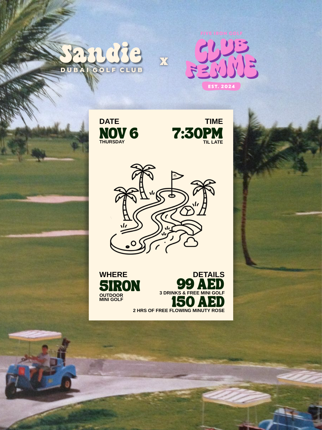 Sandie x Club Femme Social @ Five Iron Golf! Join us for an epic night of golf, prizes, drinks, and of course, the launch of the newest Sandie products. Here’s a quick rundown:
