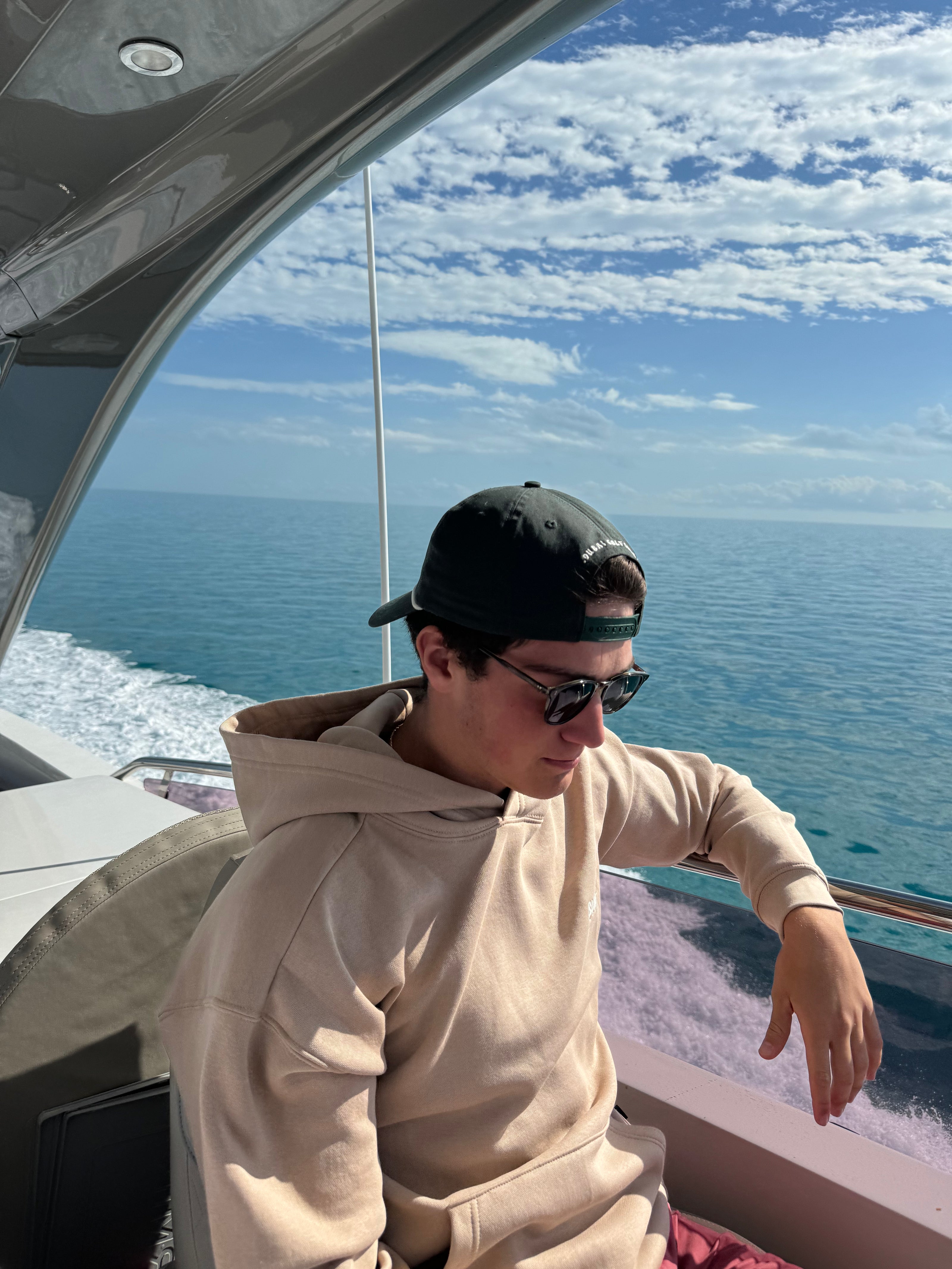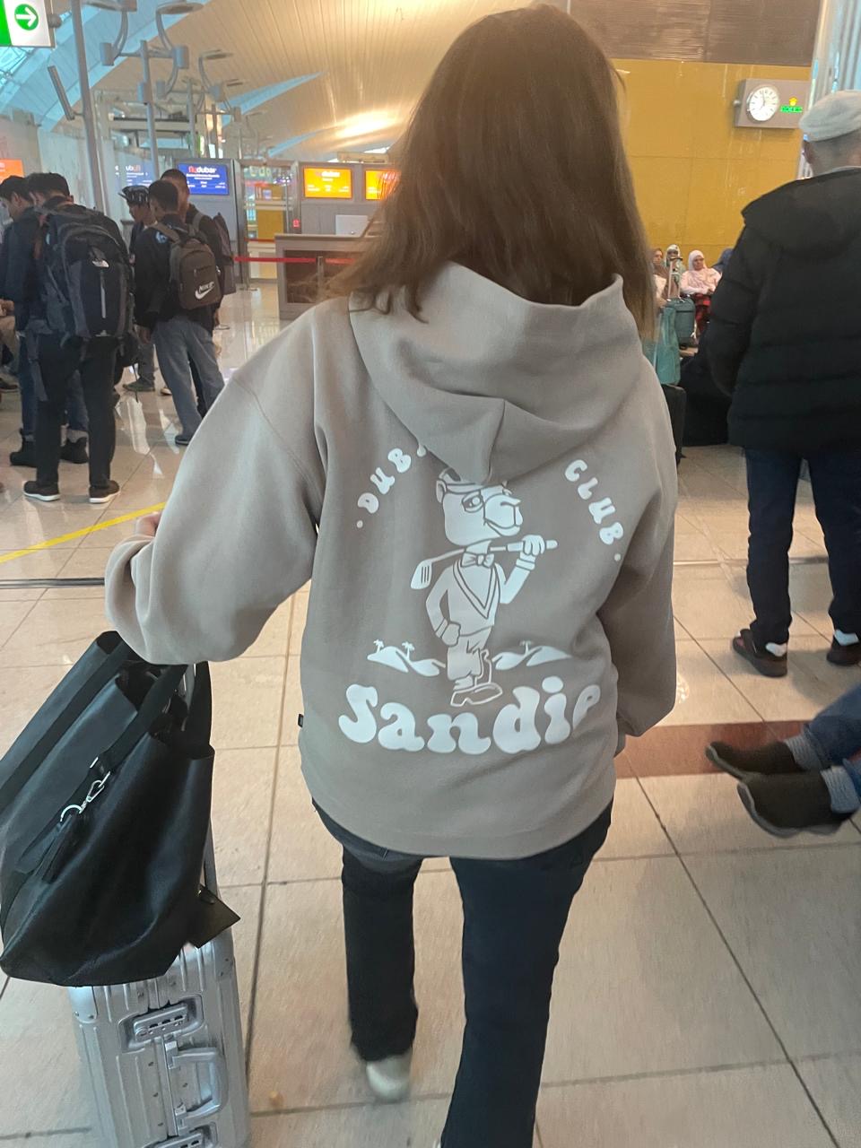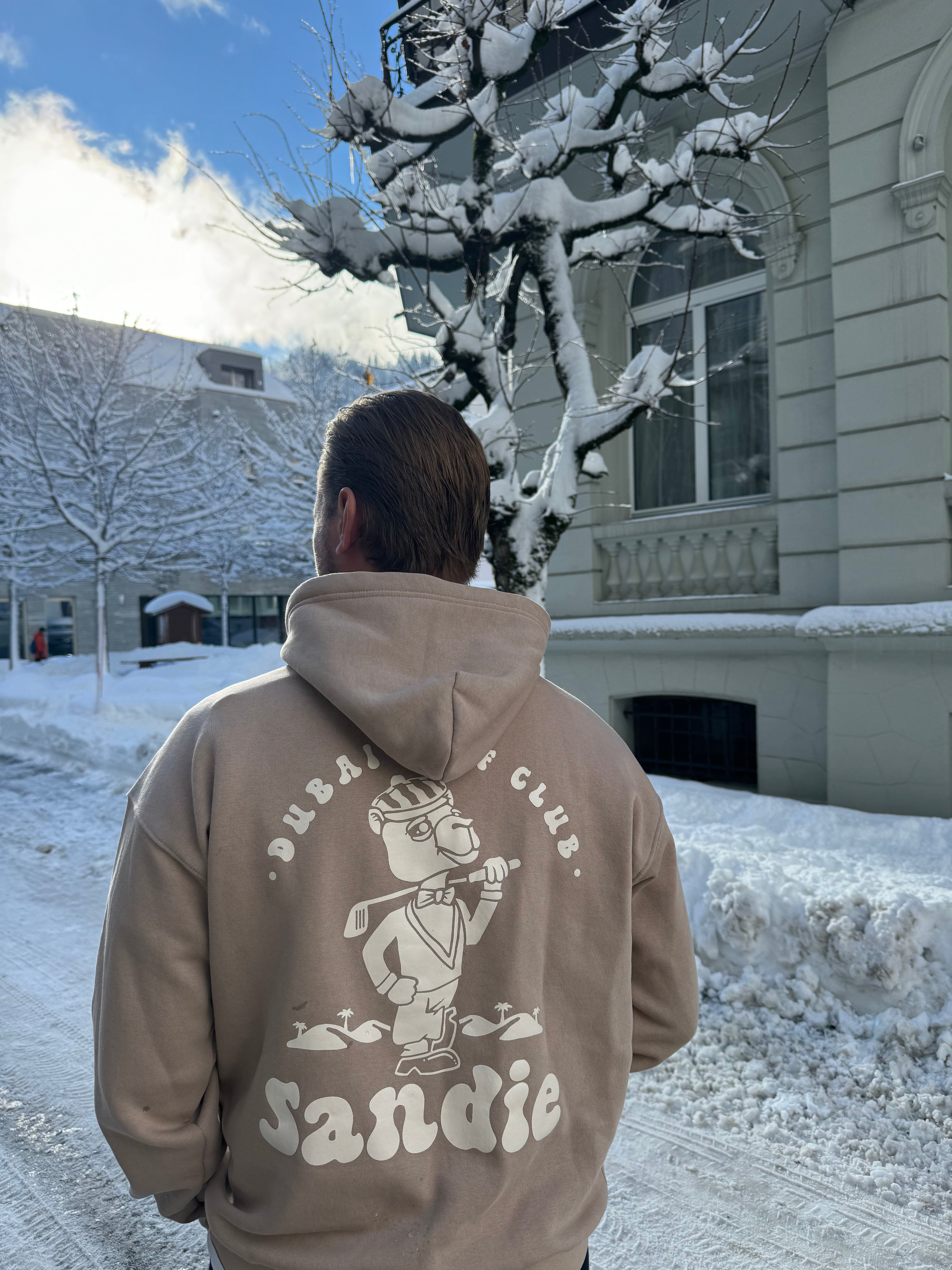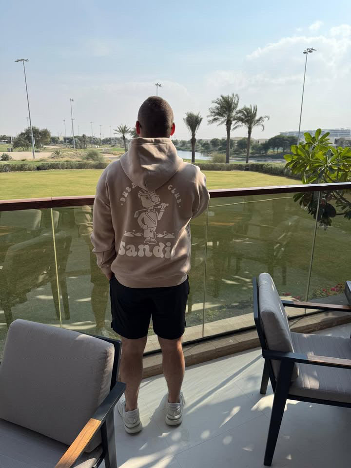 Hit the range in style with our Bunker Beige "Sandie" Signature Hoodie. Composed of 100% cotton fleece with cotton ribbed hem, cuffs, and lined hood. Perfect for late night rounds of golf, or the air conditioned club houses around Dubai.