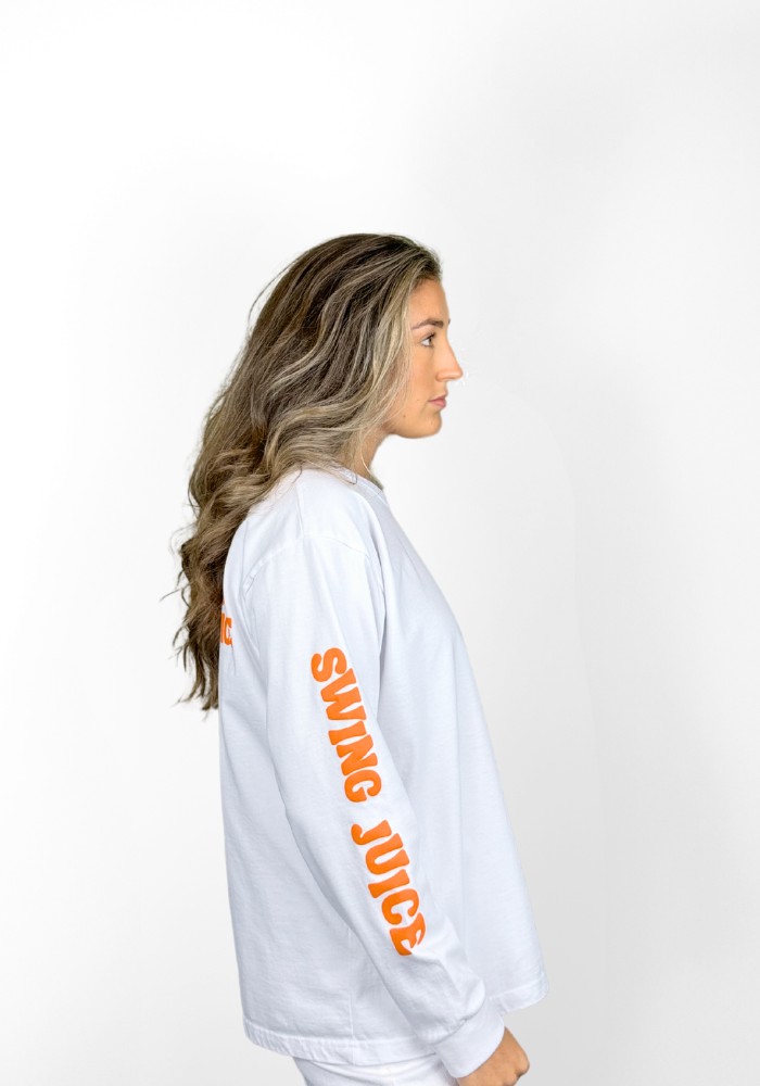 The Swing Juice Long Sleeve Tee in Orange Burst features a bold orange-toned graphic that pops off clean white cotton. This limited-edition color tee is all about fueling performance and looking sharp while doing it. From the “Fuel Your Swing” motto to the custom dual-can Swing Juice hat, every detail brings the course-to-clubhouse energy we’re known for.